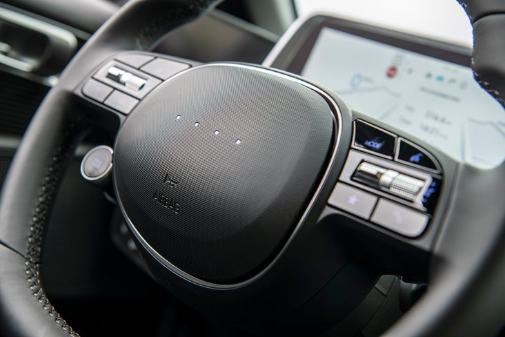 The Ioniq 6 cockpit has a dual-screen setup that’s easy to use and fun to explore. A 12.3-inch digital instrument panel synchronizes seamlessly with a 12.3-inch touchscreen display.