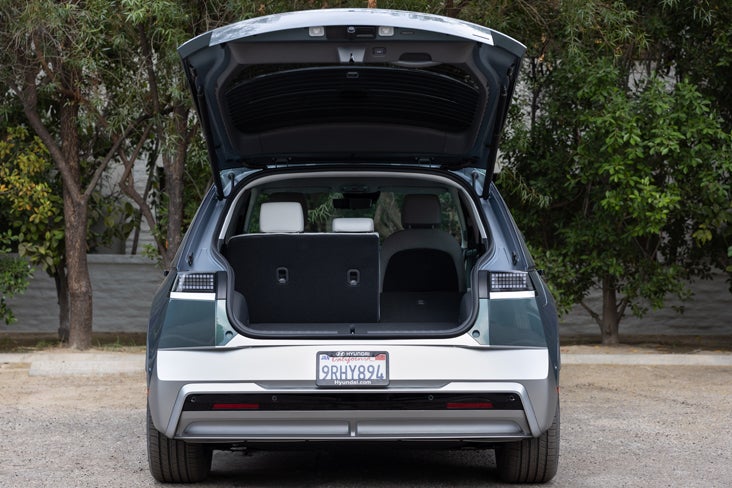 Beyond the cabin, the Ioniq 5 is designed for practicality. The rear cargo area holds 27.2 cubic feet of gear, which expands to a substantial 59.3 cubic feet with the rear seats folded down. A convenient power liftgate is available for easy access.