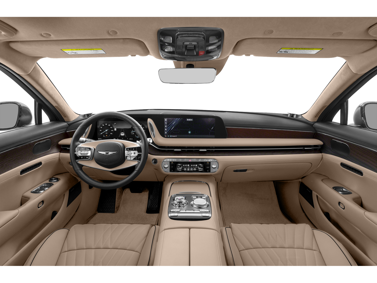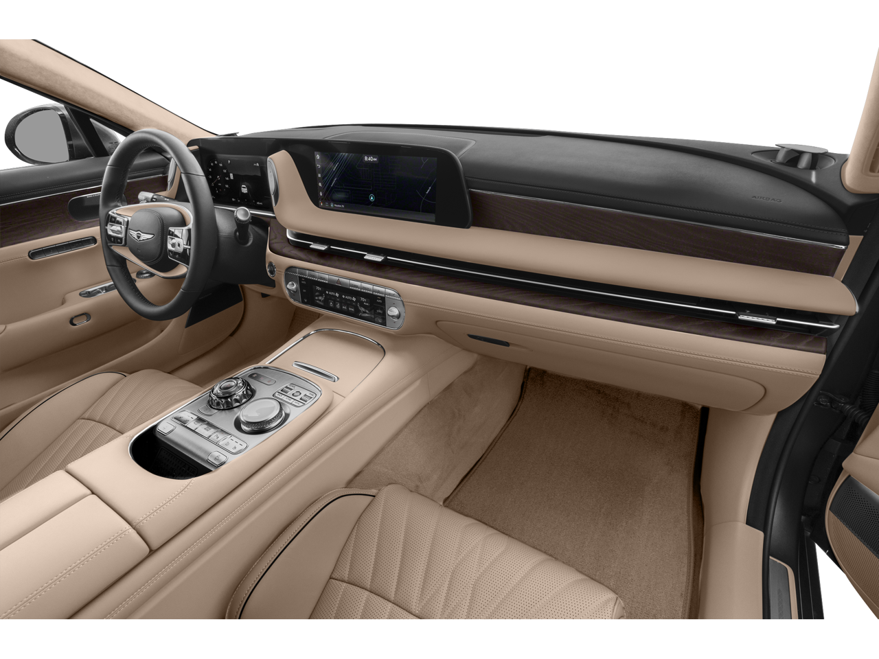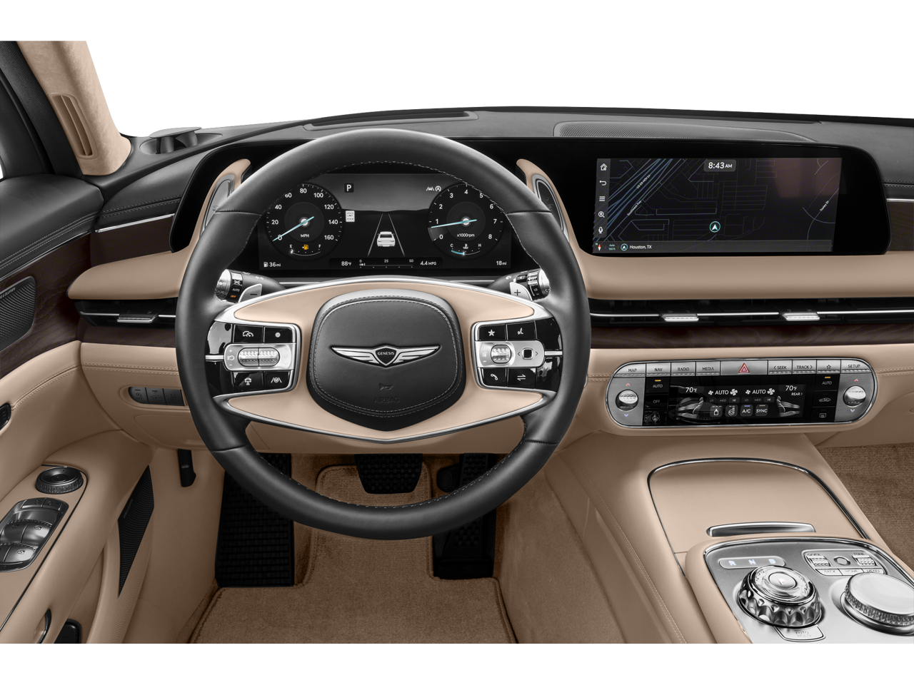 Inside, you will find Nappa leather seating surfaces, heated and ventilated front and rear seats, power front and rear seats with massage function, a microfiber suede headliner, panoramic sunroof, and a heated power tilt and telescopic steering wheel. Technology highlights include a 12.3 inch digital instrument cluster, 12.3 inch HD navigation system, Bang and Olufsen 3D premium audio, Genesis Digital Key, Surround View Monitor, Head-Up Display, Highway Driving Assist, Smart Cruise Control, and Remote Smart Parking Assist.